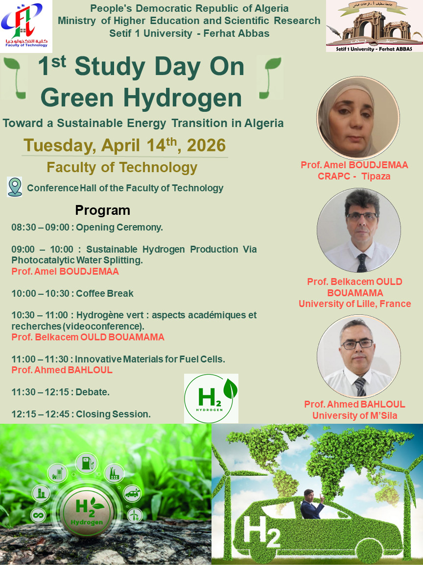 تعلن إدارة كلية التكنولوجيا بجامعة سطيف 1 فرحات عباس عن تنظيم اليوم الدراسي الاول حول الهيدروجين الاخضر حامل للطاقة و ذلك يوم الثلاثاء 14 افريل 2026 بقاعة المحاضرات للكلية ابتداء من الساعة الثامنة ونصف صباحاً وفق البرنامج المرفق في الملصقة.